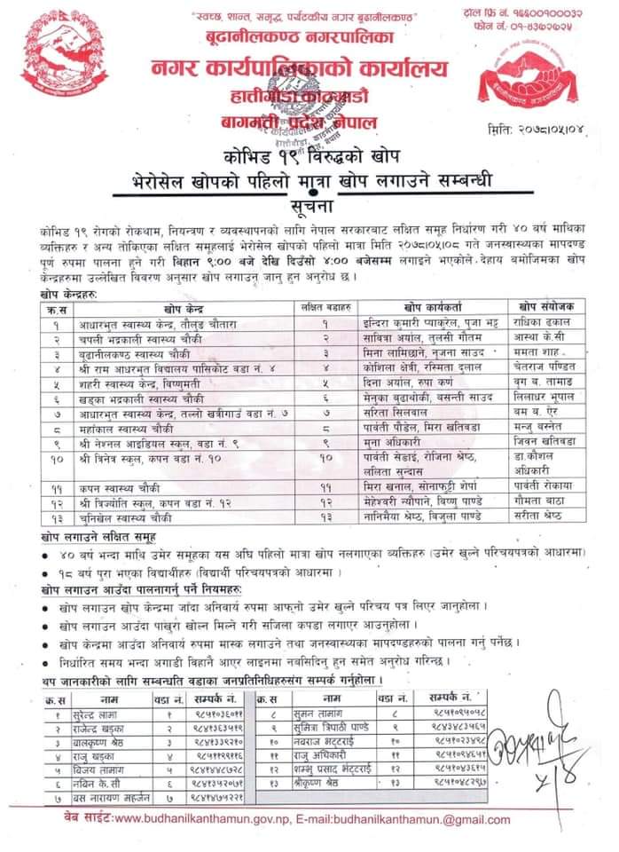 भदौ ८ काठमाडौ । बुढानिलकण्ठ नगरपालिकामा भदौ ८ गतेदेखि सम्पुर्ण वडमा खोप लगाउदै छ । महानगरपालिकाले आफ्नो सबै १३ वटै वडामा बसोबास गर्ने नागरिकलाई प्राथमिकतामा राखेर भेरोसेल खोपको पहिलो मात्रा आज भाद्र ८ गते देखि प्रत्येक वडामा लगाइदै छ । नगरपालिकाले सुचना जारी गर्दै ४० वर्ष माथिका नागरिक र १८ वर्ष उमेर पुरा गरेका विद्यार्थीहरुलाई खोप लगाइने जानकारी दिएको छ ।