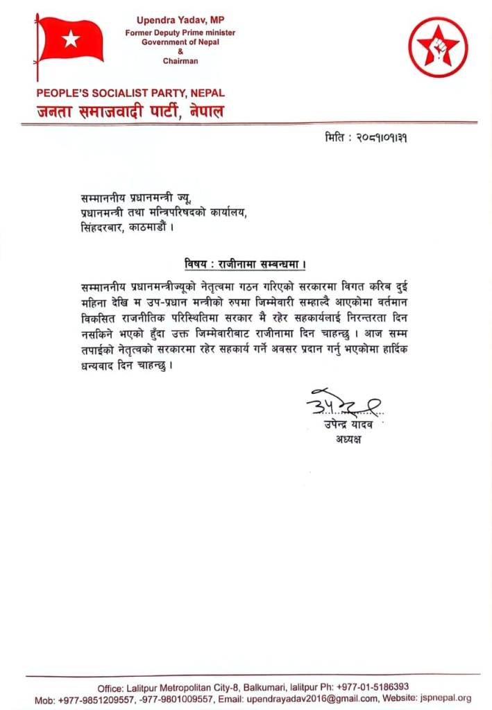 बैषाख ३१ गते काठमाडौं । उपप्रधानमन्त्रीसमेत रहेका स्वास्थ्य तथा जनसंख्या मन्त्री उपेन्द्र यादवले पदबाट राजीनामा दिएका छन् ।