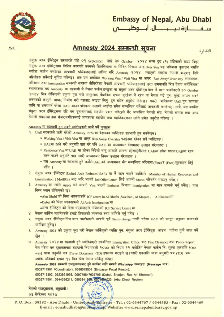 यूएईस्थित नेपाली दूतावासले आममाफी प्रक्रियामा सहभागी हुन चाहनेहरुलाई पासपोर्ट नभएमा निःशुल्क रुपमा एकतर्फी यात्रा अनुमतिपत्र दिने व्यवस्था गरेको छ । यसरी नेपाल फर्किंदा हवाइ टिकट भने आफैंले किन्नुपर्नेछ ।