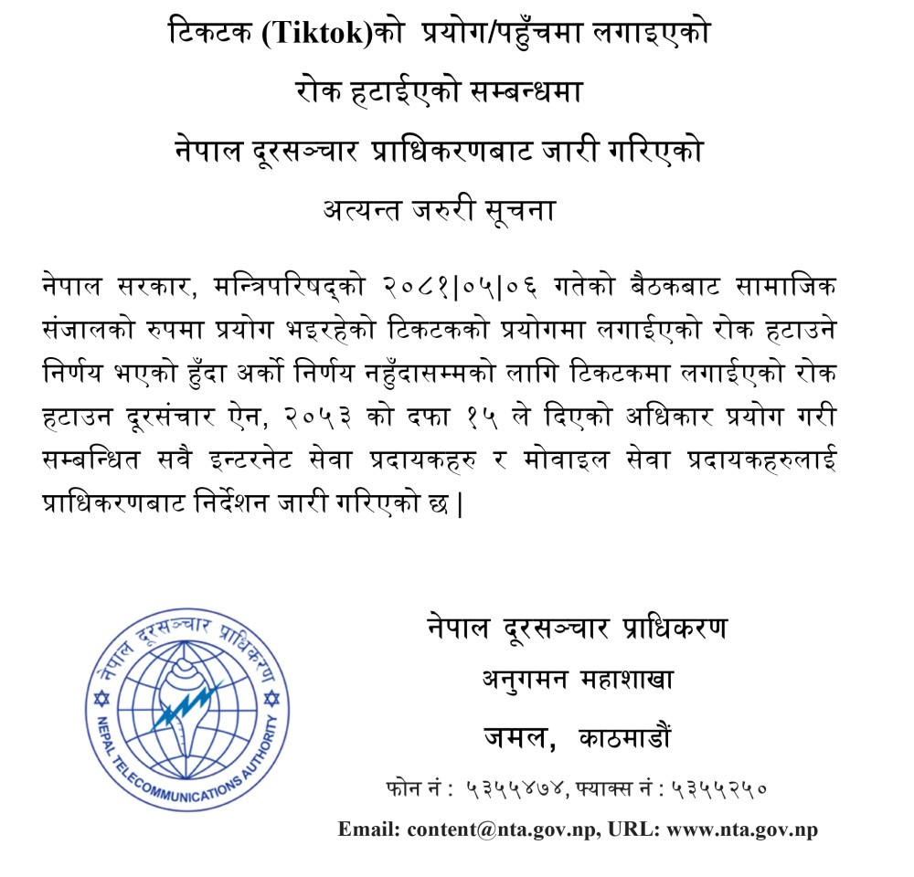 सूचनामा भनिएको छ, ‘नेपाल सरकार, मन्त्रिपरिषद्को २०८१/०५/०६ गतेको बैठकबाट सामाजिक सञ्जालको रुपमा प्रयोग भइरहेको टिकटकको प्रयोगमा लगाइएको रोक हटाउने निर्णय भएको हुँदा अर्को निर्णय नहुँदासम्मको लागि टिकटकमा लगाइएको रोक हटाउन दूरसञ्चार ऐन, २०५३ को दफा १५ ले दिएको अधिकार प्रयोग गरी सम्बन्धित सबै इन्टरनेट सेवा प्रदायकहरु र मोबाइल सेवा प्रदायकहरुलाई प्राधिकरणबाट निर्देशन जारी गरिएको छ |’