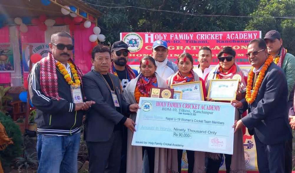 महेन्द्रनगरस्थित होली फेम्ली क्रिकेट एकेडेमीले यु–१९ महिला क्रिकेट टोलीका सदस्य सावित्री धामी र स्नेहा महरालाई शनिबार ३०/३० हजारसहित सम्मान गरेको हो । त्यसैगरी नेपाली महिला क्रिकेट टोलीकी उपकप्तान विन्दु रावललाई रु ५० हजार र टोलीका सहायक प्रशिक्षक जानकी भट्टलाई रु ३० हजार नगदसहित दोसल्ला ओढाएर सुदूरपश्चिम प्रदेशका आर्थिक मामिलामन्त्री बहादुरसिंह थापाले सम्मान गरे ।