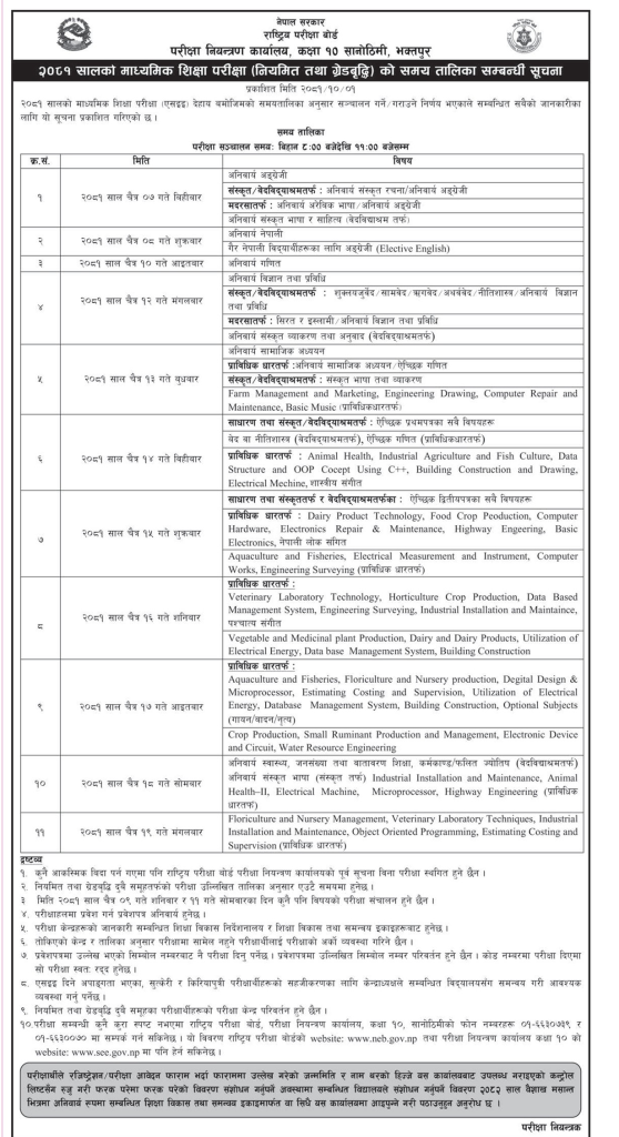 चैत १० गते अनिवार्य गणित र चैत १२ गते अनिवार्य विज्ञान विषयको परीक्षा हुने परीक्षा नियन्त्रण कार्यालयको तालिकामा उल्लेख छ ।