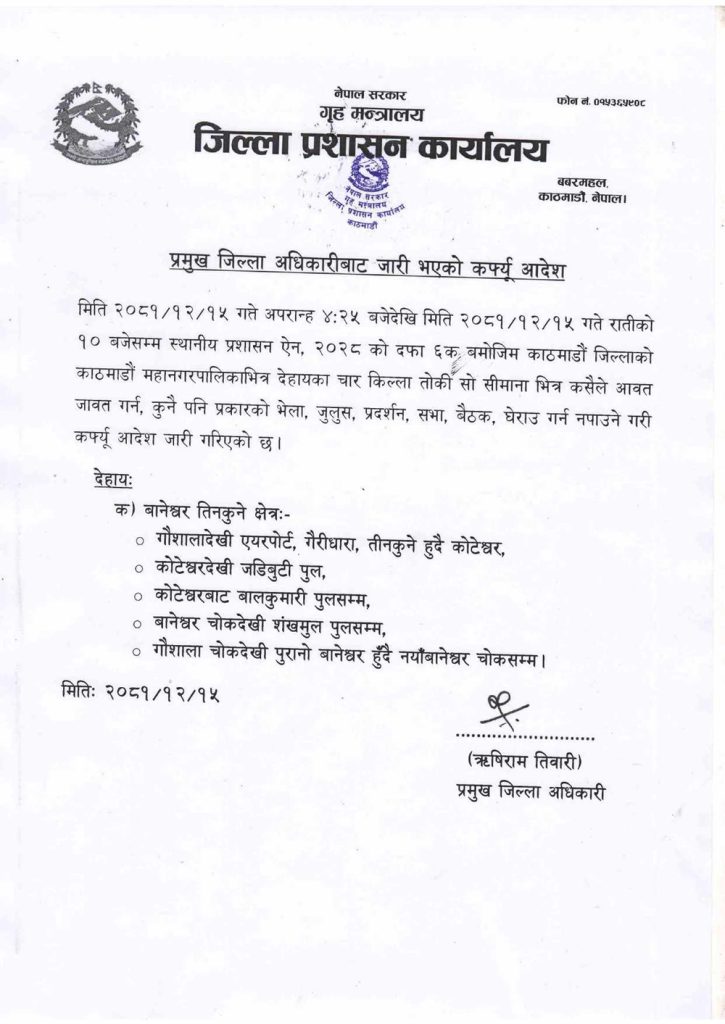 जारी भएको आदेश अनुसार गौशालादेखि एयरपोर्ट, गैरीधारा, तीनकुने हुँदै कोटेश्वर, कोटेश्वरबाट जडिबुटी पुल, कोटेश्वरबाट बालकुमारी पुल, नयाँबानेश्वर चोकदेखि शंखमुल पुलसम्म र गौशाला चोकदेखि पुरानो बानेश्वर हुँदै नयाँ बानेश्वर चोकसम्म कर्फ्यु लगाइएको जिल्ला प्रशासन कार्यालयले जनाएको छ ।