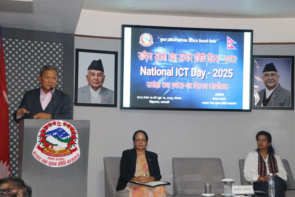 मन्त्रायले सोमबार राष्ट्रिय सूचना तथा सञ्चार प्रविधि दिवस–२०८२ को समीक्षा तथा प्रशंसा–पत्र वितरण कार्यक्रममा मन्त्री गुरुङले सूचना प्रविधिको विकास स्थानीय तहसम्मै व्यापक हुनुपर्नेमा जोड दिए ।
