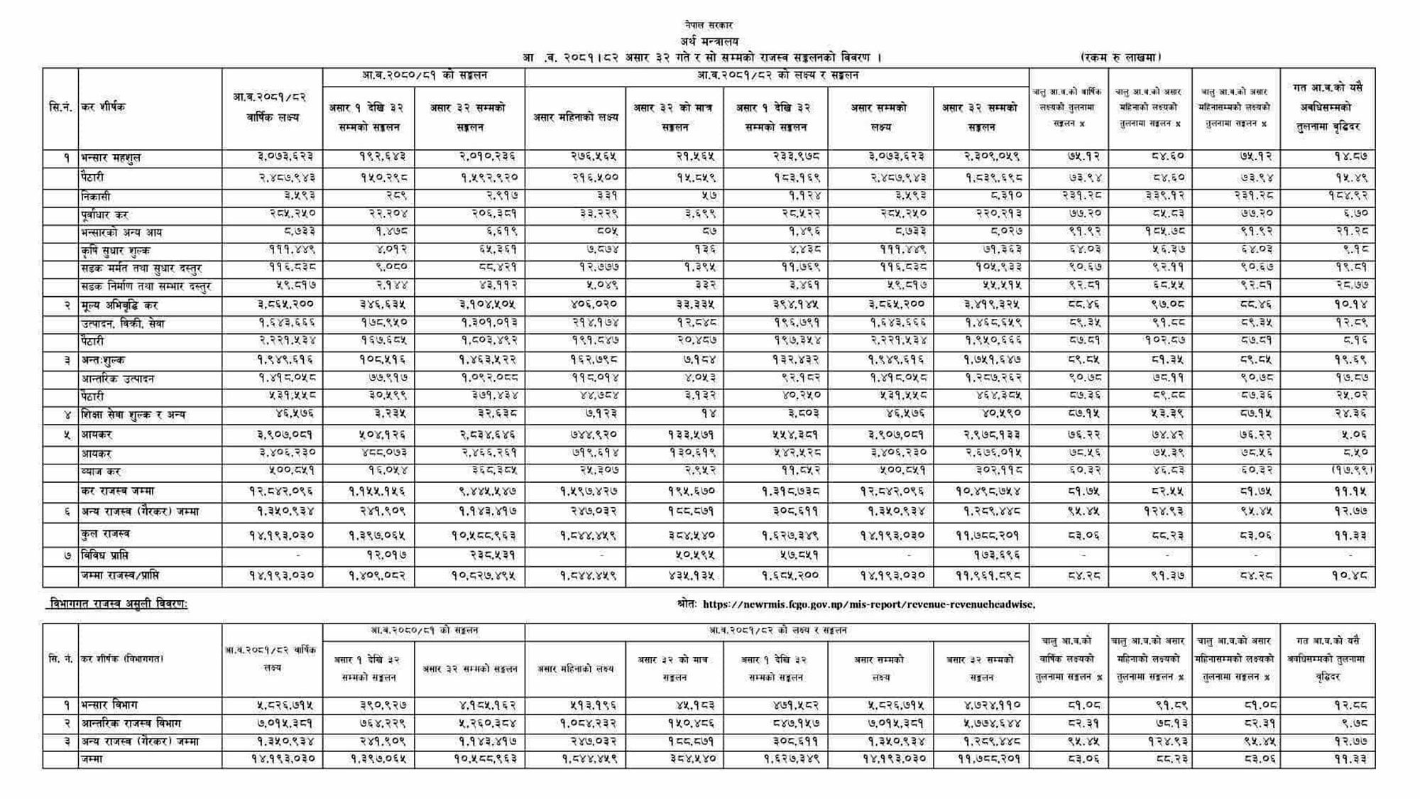 आर्थिक वर्ष २०८०/०८१ को भन्दा यो एक खर्ब २० अर्ब बढी हो । प्रतिशतका आधारमा ११.३३ प्रतिशत वृद्धि भएको छ । आर्थिक वर्ष २०८०/०८१ मा १० खर्ब ५८ अर्ब राजस्व संकलन भएको थियो । आर्थिक वर्ष २०८१/०८२ मा १४ खर्ब १९ अर्ब राजस्व संकलन गर्ने लक्ष्य थियो । अर्ध वार्षिक समीक्षामा संशोधन गरी १२ खर्ब ८६ अर्बको लक्ष्य तय गरिएको थियो । संशोधित लक्ष्य अनुसार ९१.६० प्रतिशत राजस्व संकलन भएको छ ।