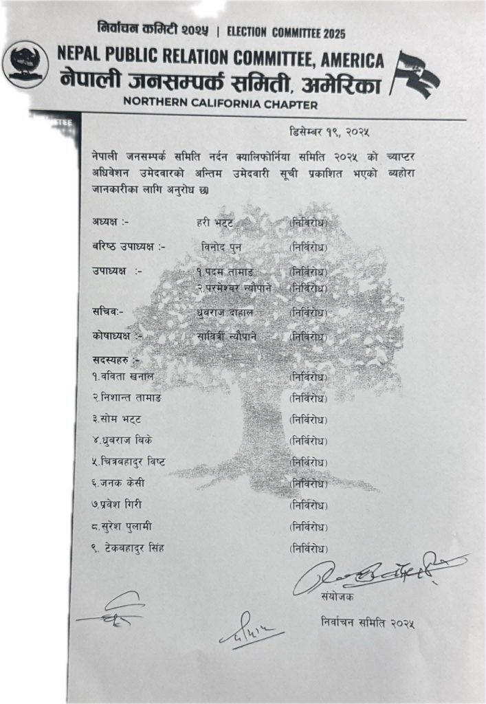 निर्वाचन आयोगले आजै १५ जना पदआधिकारीको कार्यसमिति निर्विरोध चयन गरिएको छ । जसमा अध्यक्षमा हरि भट्ट, वरिष्ठ उपाअध्यक्षमा विनोद पुन, सचिवमा धुव्रराज दाहाल , कोष अध्यक्षमा सावित्री न्यौपाने सहित ९ जना सदस्य छन ।