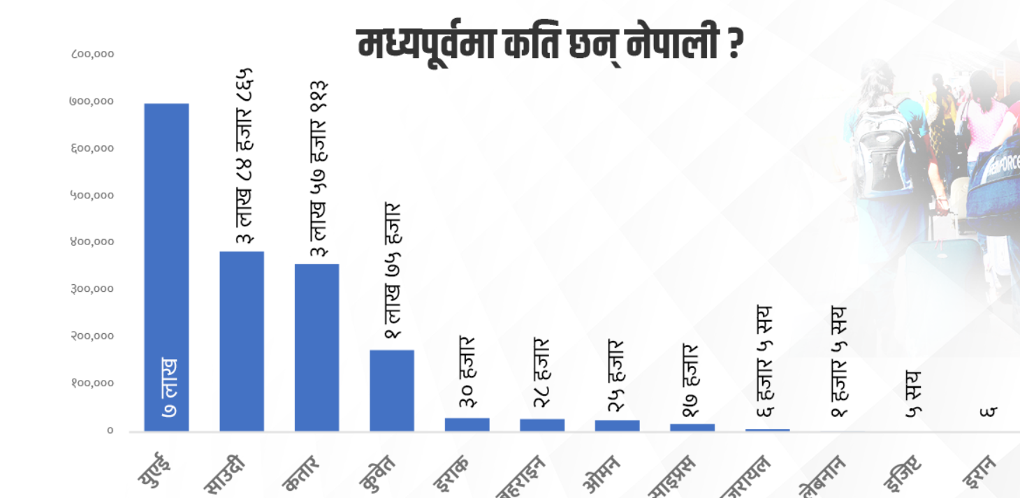 परराष्ट्र मन्त्रालयले आज गरेको पत्रकार सम्मेलन मार्फत ती देशमा रहेका नेपालीको यकिन संख्याबारे जानकारी दिएको हो । इरान, युनाइटेड अरब इमिरेट्स (यूएई), साउदी अरब, कतार, कुवेत, इराक, बहराइन, ओमान, साइप्रस, इजरायल, लेबनान र इजिप्टमा उक्त संख्यामा नेपाली रहेको सहसचिव खड्काले बताए ।