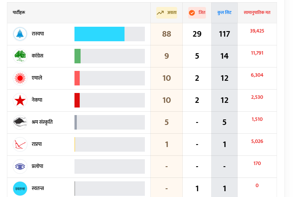 समानुपातिकतर्फको मतगणनामा पनि रास्वपाको आग्रता रहेको छ । विघटित प्रतिनिधिसभामा रास्वपा चौथो दल थियो । यो पटक स्पष्ट एकल बहुमतको रुपमा अगाडि आएको छ । विघटित प्रतिनिधिसभामा पहिलो दोस्रो र तेस्रो दल रहेका नेपाली कांग्रेस, नेकपा एमाले र नेपाली कम्युनिस्ट यसपटक निकै खुम्चिएका छन् ।