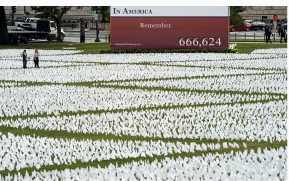 असोज २, क्यालिफोर्निया । अमेरिकामा कोभिड- १९ संक्रमणबाट मृत्यु भएकाको सम्झनामा ६ लाखभन्दा बढी सेतो झण्डा गाडिएको छ । शुक्रबार वासिङटन नजिकै नेसनल मलको अगाडि ६ लाख ५० हजार सेतो झण्डा गाडिएको हो ।