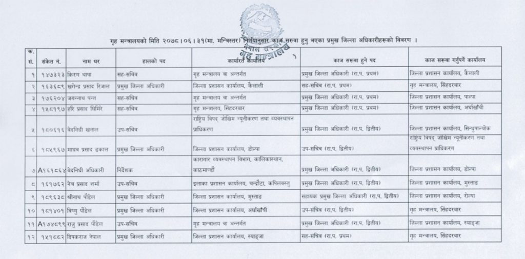 निर्णय अनुसार कैलालीका प्रजिअ खगेन्द्रप्रसाद रिजाललाई गृहमन्त्रालयमा, डोल्पाका प्रजिअ माधवप्रसाद ढकाललाई राष्ट्रिय विपद् जोखिम न्यूनीकरण तथा व्यवस्थापन प्राधिकरणमा, मुस्ताङका प्रजिअ श्रीनाथ पौडेललाई रोल्पाको सहायक प्रजिअमा पठाइएको छ । यस्तै अर्घाखाँचीका प्रजिअ विष्णु पौडेल र स्याङजाका प्रजिअ दिपकराज नेपाललाई गृहमन्त्रालयमा ल्याईएको छ ।
