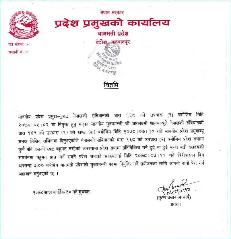मुख्यमन्त्री अष्टलक्ष्मी शाक्यले आज बुधबार राजीनामा दिएपछि प्रदेश प्रमुख यादवचन्द्र शर्माले नयाँ सरकार गठनका लागि दलहरुलाई आह्वान गरेका हुन्।