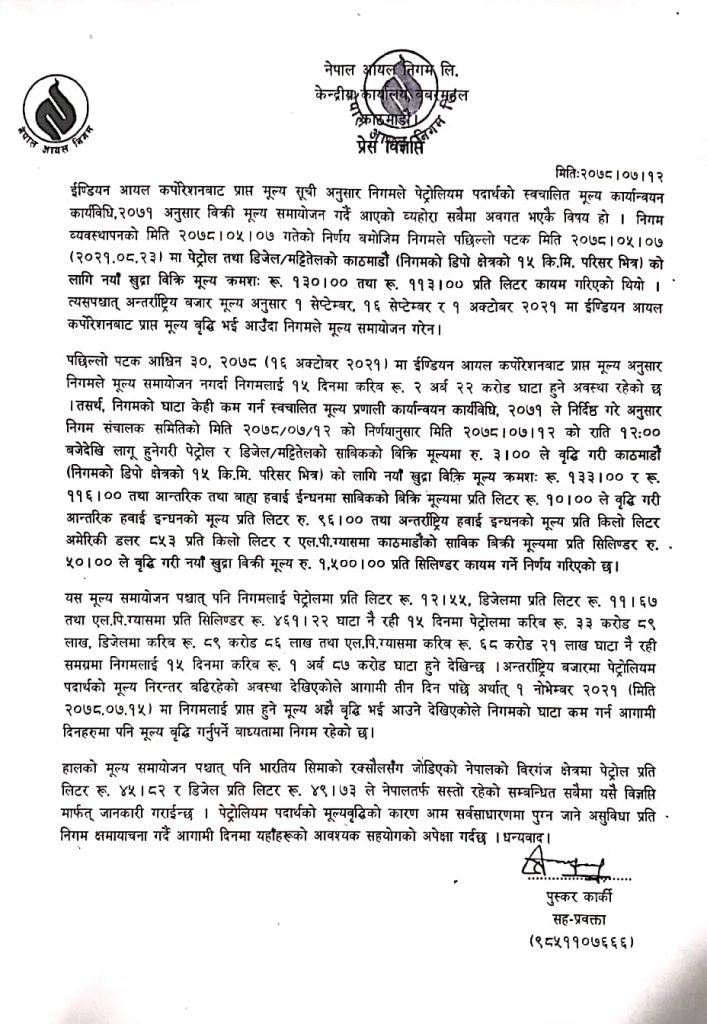 कार्तिक १२, काठमाडौं । सरकारले फेरि पेट्रोलियम पदार्थको मूल्य बढाएको छ ।