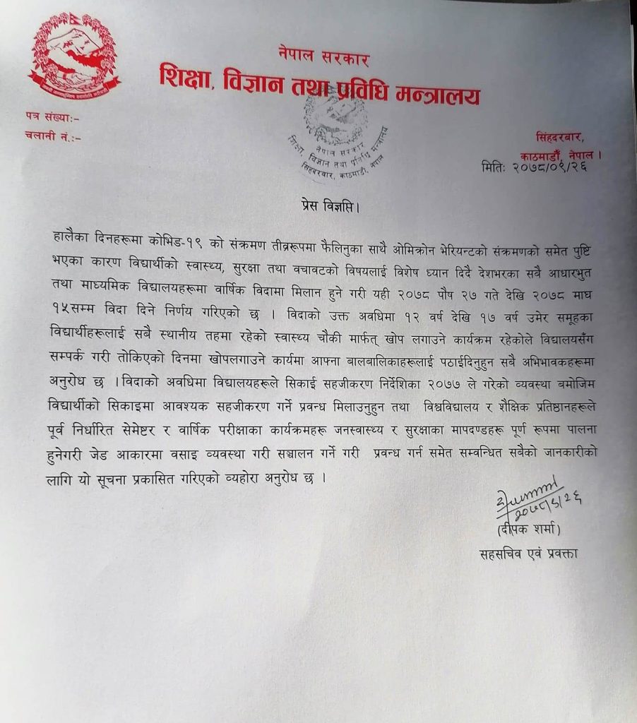 शिक्षा, विज्ञान तथा प्रविधि मन्त्रालयले आज सूचना निकालेर पुस २७ देखि माघ १५ गतेसम्म देशभरका आधारभूत र माध्यामिक तहका विद्यालय बिदा गर्ने निर्णय गरेको हो ।
