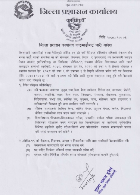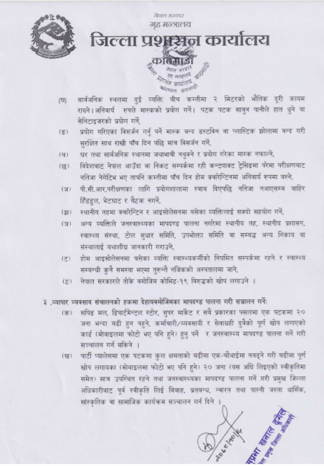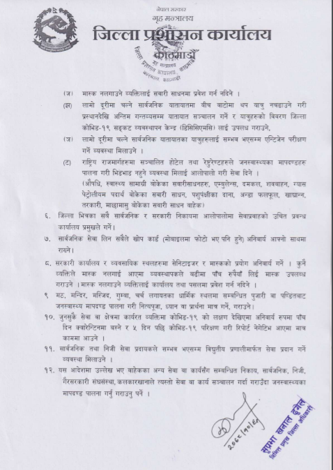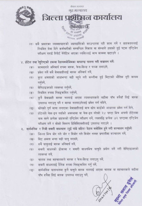 यसैगरी, सिट क्षमताभन्दा बढी यात्रु नराख्ने, अनिवार्य मास्कको प्रयोग, सेनिटाइजरको व्यवस्था, चालक र सहचालकले फेस सिल्ड लगाउनुपर्ने, सवारीसाधनलाई दैनिक निसंक्रमित गर्ने, मास्क नलगाउने व्यक्तिलाई सवारीसाधनमा प्रवेश नदिने प्रशासनको आदेशमा उल्लेख छ ।