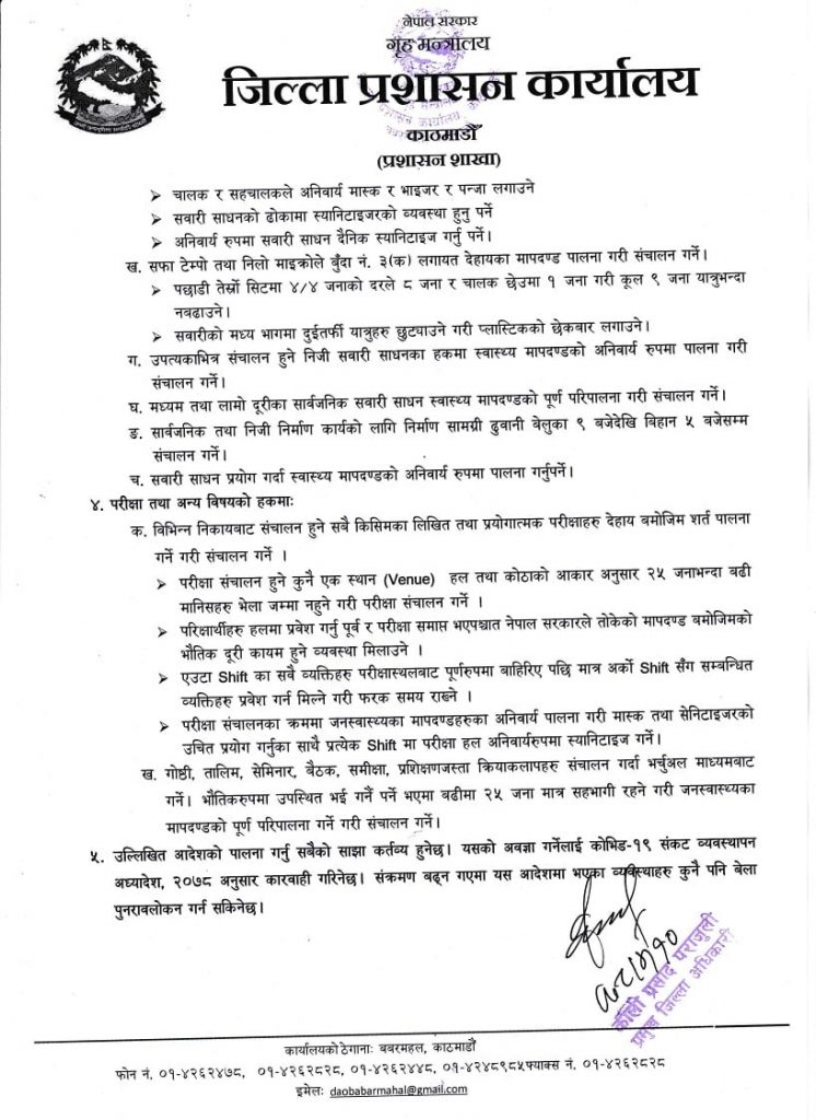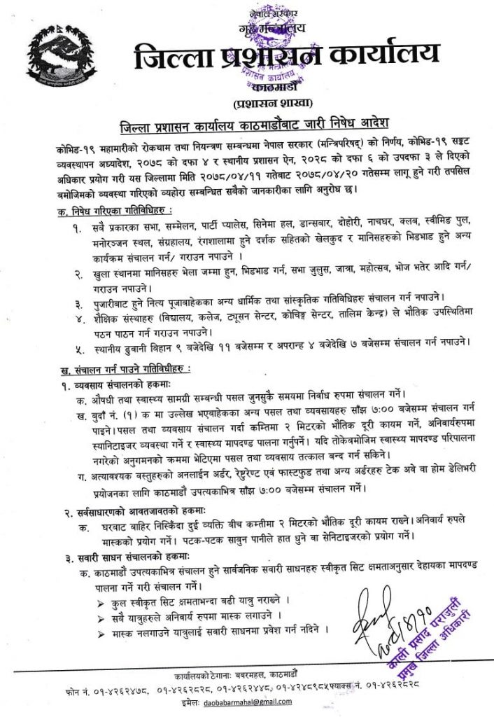यसअघि लागू गरिएका निषेधाज्ञाका नियमहरुमा कुनै परिवर्तन नभएको काठमाडौँका प्रमुख जिल्ला अधिकारी कालिप्रसाद पराजुलीले जानकारी दिए।
