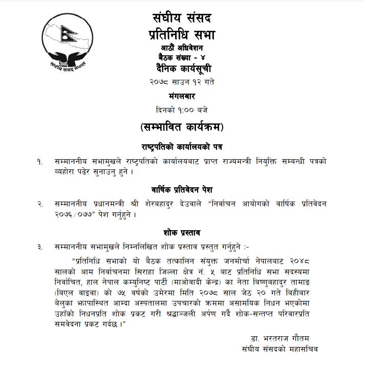 यसैगरी प्रधानमन्त्री शेरबहादुर देउवाले निर्वाचन आयोगको वार्षिक प्रतिवेदन २०७६/७७ पेस गर्ने र पूर्वसांसद विष्णुबहादुर तामाङको निधनमा सभामुखले शोक प्रस्ताव प्रस्तुत गर्ने आजको सम्भावित कार्यसूचीमा उल्लेख छ।