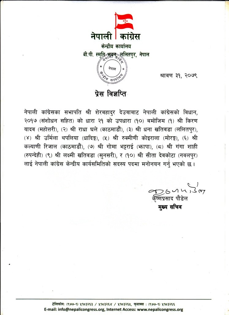 पार्टीका मुख्यसचिव कृष्णप्रसाद पौडेलले सभापति देउवाले मङलबार किरण यादव, राधा घले, धना खतिवडा, उर्मिला थपलिया, रूक्मीणी कोइराला, कल्याणी रिजाल, गोमा भट्टराई, गंगा शाही, लक्ष्मी खतिवडा, सीता देवकोटालाई केन्द्रीय सदस्य मनोनीत गरेका जानकारी दिए ।