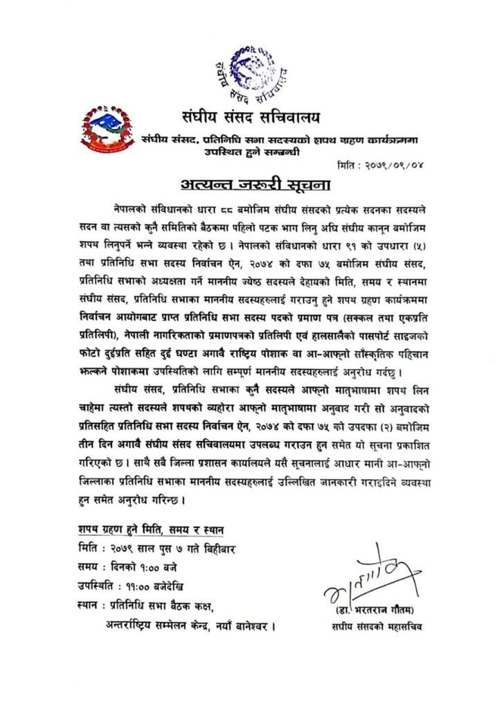 संघीय संसद सचिवालयले सूचना प्रकाशन गर्दै सांसदहरूलाई शपथ ग्रहणकालागि नयाँ बानेश्वरस्थित सांसद भवनमा दिउँसो १ बजे बोलाएको छ ।